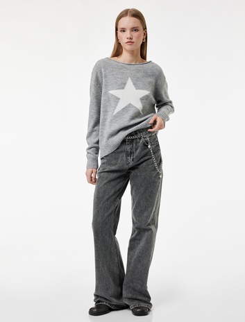 Uzun Kollu Yuvarlak Geniş Yaka Yıldız Desenli Triko Kazak
