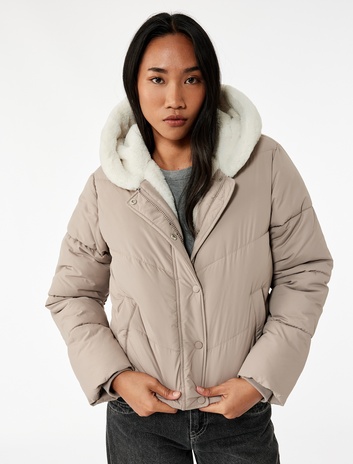 Uzun Kollu Cepli Düğmeli Su İtici Kapüşonlu İçi Suni Kürklü Kısa Şişme Mont Sepete Ekle