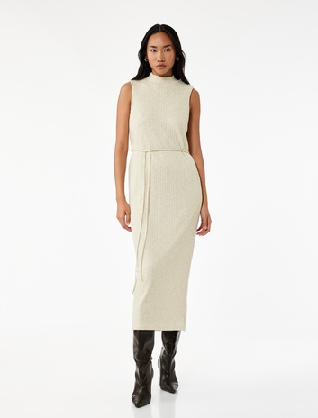 Slim Fit Parıltılı Kemerli Kolsuz Dik Yaka Midi Boy Kalem Elbise Sepete Ekle