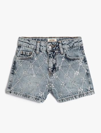 Kız Çocuk Kot Şort Ekstra Mini Slim Parıltılı Boncuk İşlemeli Pamuklu