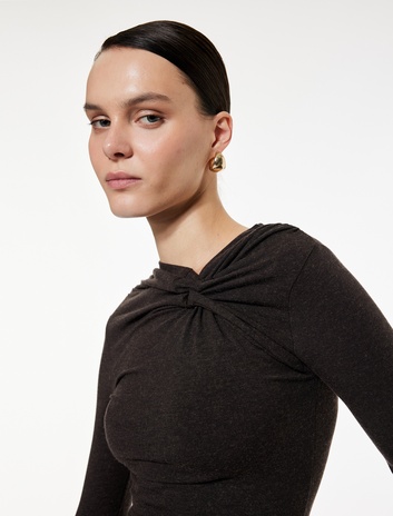 Uzun Kollu Asimetrik Yaka Düğüm Detaylı Bluz
