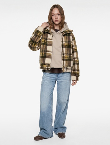 Cepli Fermuarlı Uzun Kollu Rahat Kalıp Dik Yaka Ekoseli Peluş Hırka