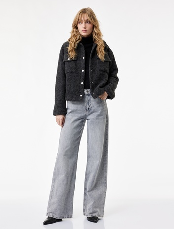 Düğmeli Uzun Kollu Kapaklı Cep Detaylı Peluş Ceket