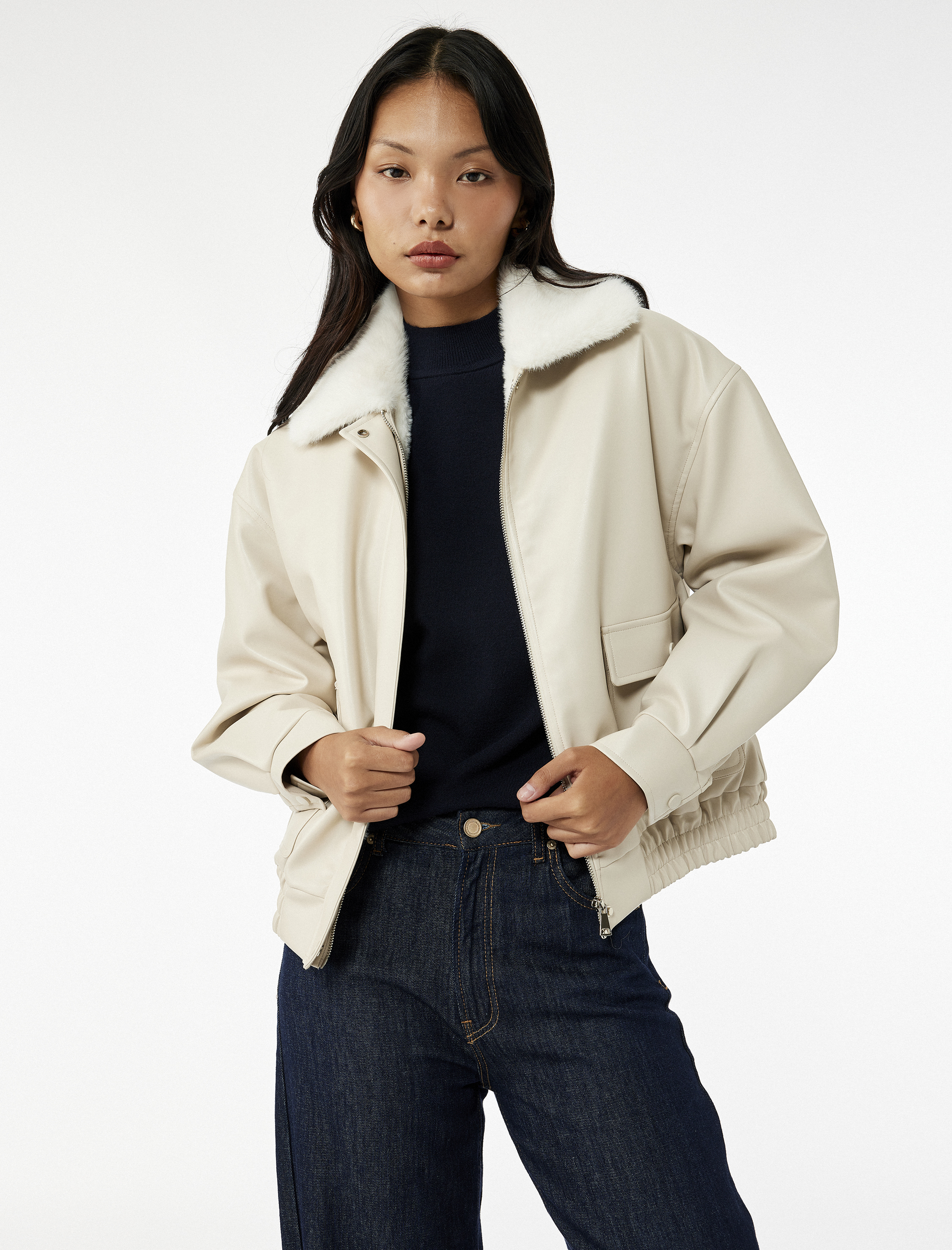 Suni Kürk Yaka Rahat Kalıp Fermuarlı Cep Detaylı Bomber Ceket
