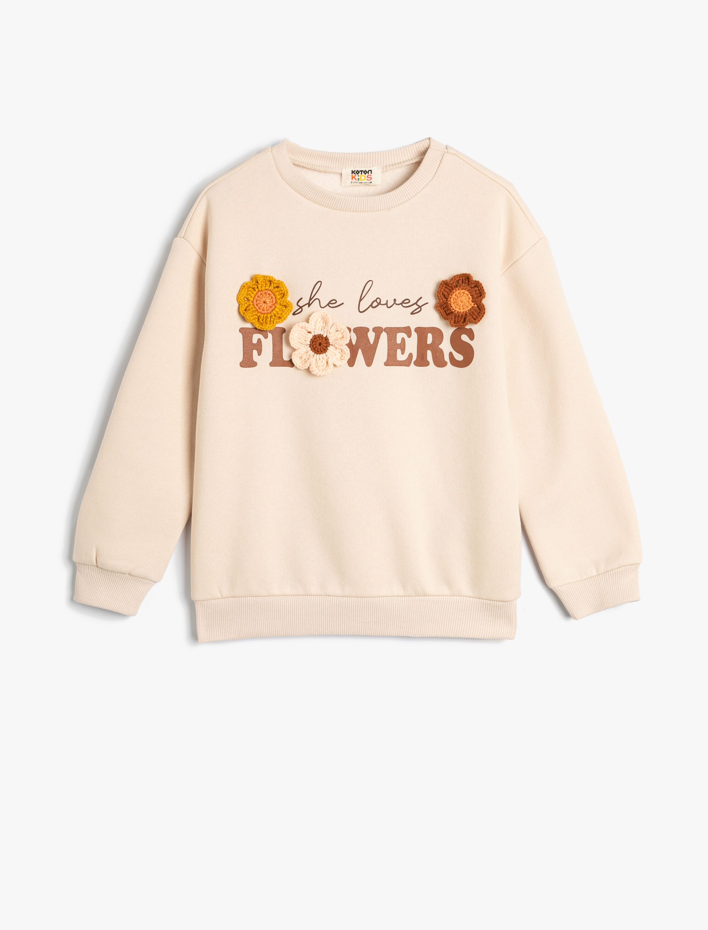 Kız Çocuk Sweat Çiçek Aplike Detaylı Uzun Kollu Bisiklet Yaka Şardonlu