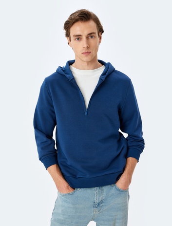 Kapşonlu Pamuk Karışımlı Şardonlu Basic Yarım Fermuarlı Sweatshirt Sepete Ekle