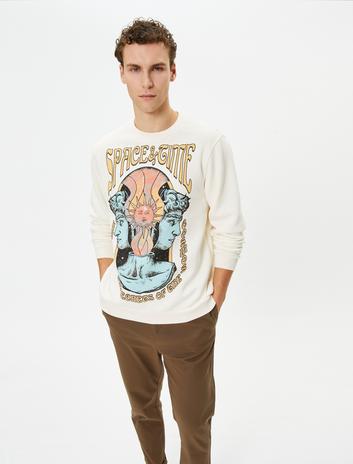 Bisiklet Yaka Sweatshirt Mistik Baskılı Uzun Kollu Ribanalı Şardonlu