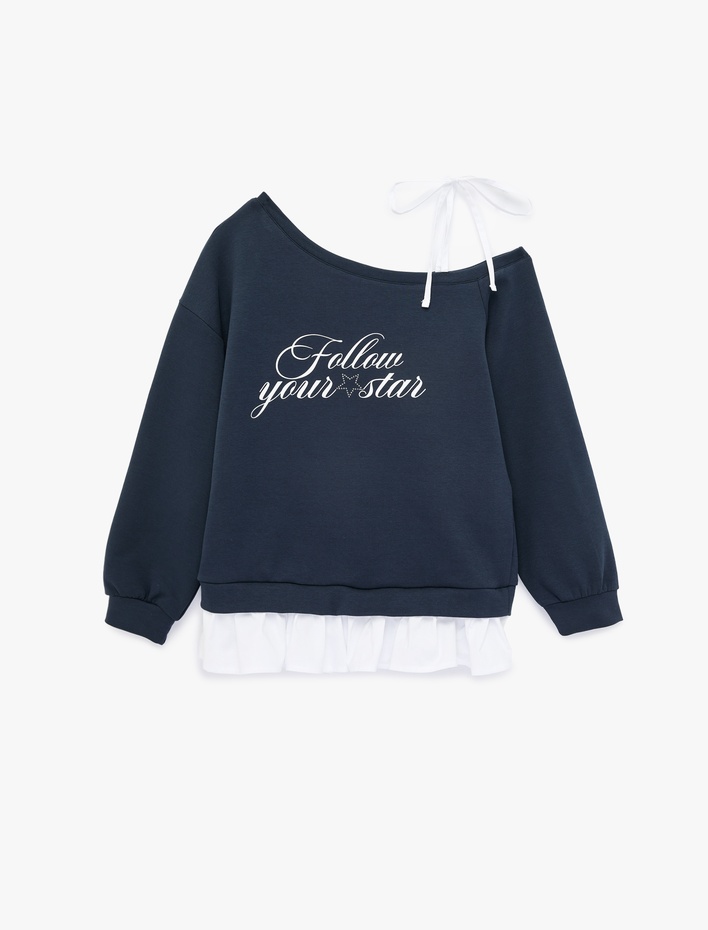 Fiyonk Detaylı Pamuklu Uzun Kollu Asimetrik Yaka Baskılı Sweatshirt Sepete Ekle