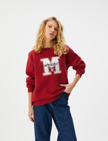 Şardonlu Kolej Oversize Sweatshirt Aplike Detaylı Bisiklet Yaka Uzun Kollu