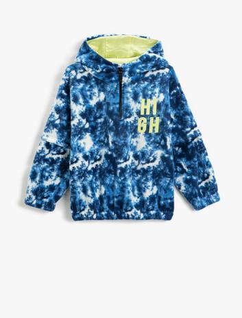 Erkek Çocuk Polar Kapşonlu Sweatshirt Yarım Fermuarlı Batik Desenli Manşetleri ve Beli Lastikli