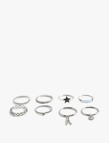 { "id": "8684846373638", "name": "Taş Detaylı Charmlı Çelik 8'li Yüzük Seti", "taxonomy":["ACCESSORIES","ACCESSORIES","WOMEN","JEWELLERY","RINGS"], "currency": "TRY", "unit_price": 349.99 , "unit_sale_price": 349.99 , "url": "https://www.koton.com/tas-detayli-charmli-celik-8-li-yuzuk-seti-gumus-rengi-4092617/", "stock": 162, "color": "GÜMÜŞ", "size": "M", "product_image_url": "https://ktnimg2.mncdn.com/products/2026/04/09/3226430/79739610-af6c-4a44-b46d-e8d7e6e85587_size870x1142.jpg" }