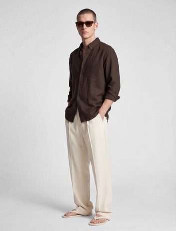 Regular Fit Düğmeli Yaka Uzun Kollu Keten Gömlek