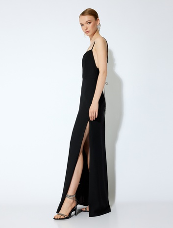 V Yaka Taşlı İp Askılı Sırtı Bağcıklı Yırtmaçlı Uzun Abiye Elbise