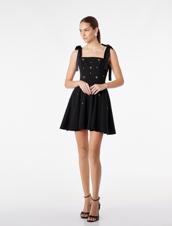 Krep Scuba Kumaş Taş Detaylı Fiyonk Bağlamalı Askılı Mini Kloş Elbise Sepete Ekle