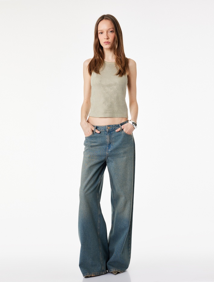 Düz Paça Normal Bel Taş Detaylı Pamuklu Denim Pantolon - Straight Fit Jean Sepete Ekle
