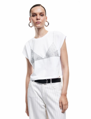 Üç İplik Pamuklu Kısa Kollu Bisiklet Yaka Boncuk Detaylı Taşlı Tişört Sepete Ekle