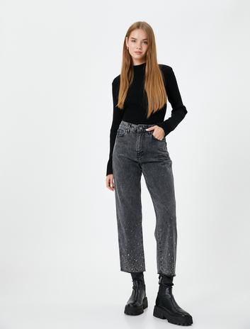 Taş Detaylı Düz Paça Düğmeli Pamuklu Jean Pantolon - Straight Fit Jean