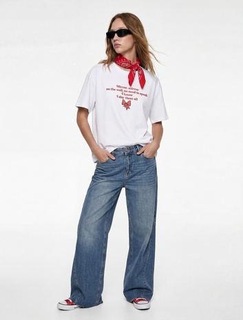 Pamuklu Kısa Kollu Bisiklet Yaka Baskılı Oversize Tişört