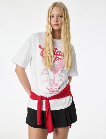 Kısa Kollu Bisiklet Yaka Pamuklu Baskılı Oversize Tişört Sepete Ekle