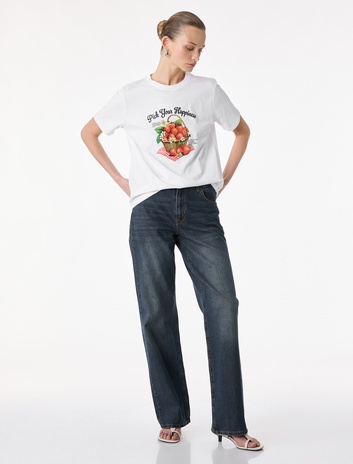Pamuklu Kısa Kollu Bisiklet Yaka Arkası Çilek Baskılı Tişört Sepete Ekle