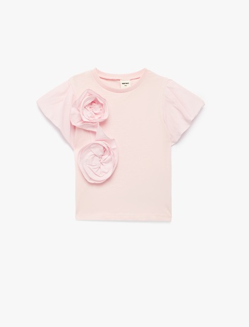 Balon Kollu Çiçek Detaylı Kısa Kollu Pamuklu Tişört Sepete Ekle