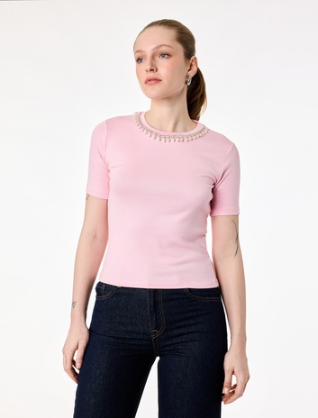 Regular Fit Kısa Kollu İnci Detaylı Bisiklet Yaka Viskon Tişört Sepete Ekle