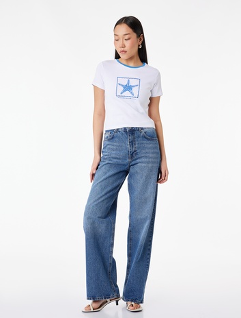 Pamuklu Kısa Kollu Bisiklet Yaka Kanat Baskılı Tişört Sepete Ekle