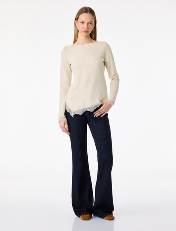 Dantel Detaylı Asimetrik Kesim Kayık Yaka Uzun Kollu Tişört Sepete Ekle