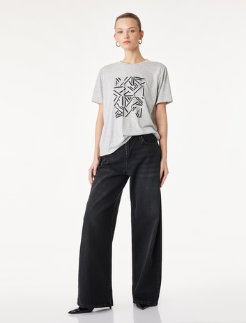 Pamuklu Bisiklet Yaka Biyeli Kısa Kollu Baskılı Tişört Sepete Ekle
