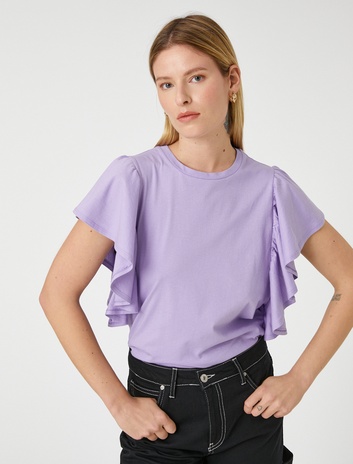 Kolları Volanlı Tişört Bisiklet Yaka Pamuklu