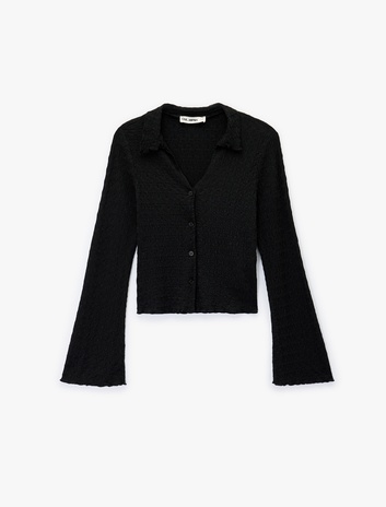 Slim Fit Uzun Kollu Düğmeli Dokulu Klasik Yaka Bluz Sepete Ekle
