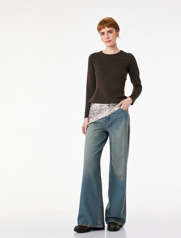 Dantel Detaylı Asimetrik Kesim Kayık Yaka Uzun Kollu Tişört