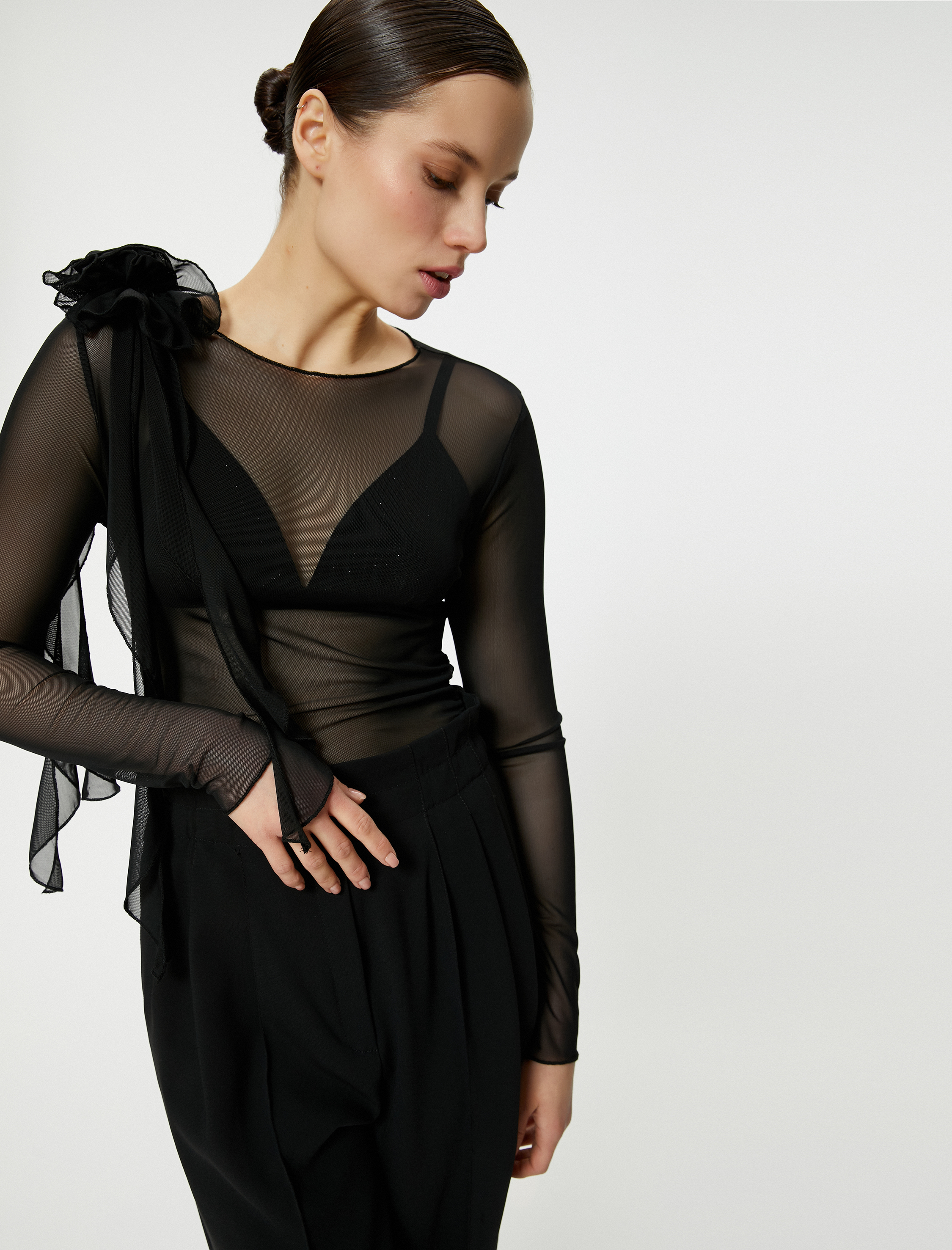 Transparan Bluz Çiçek Aplike Detaylı Uzun Kollu