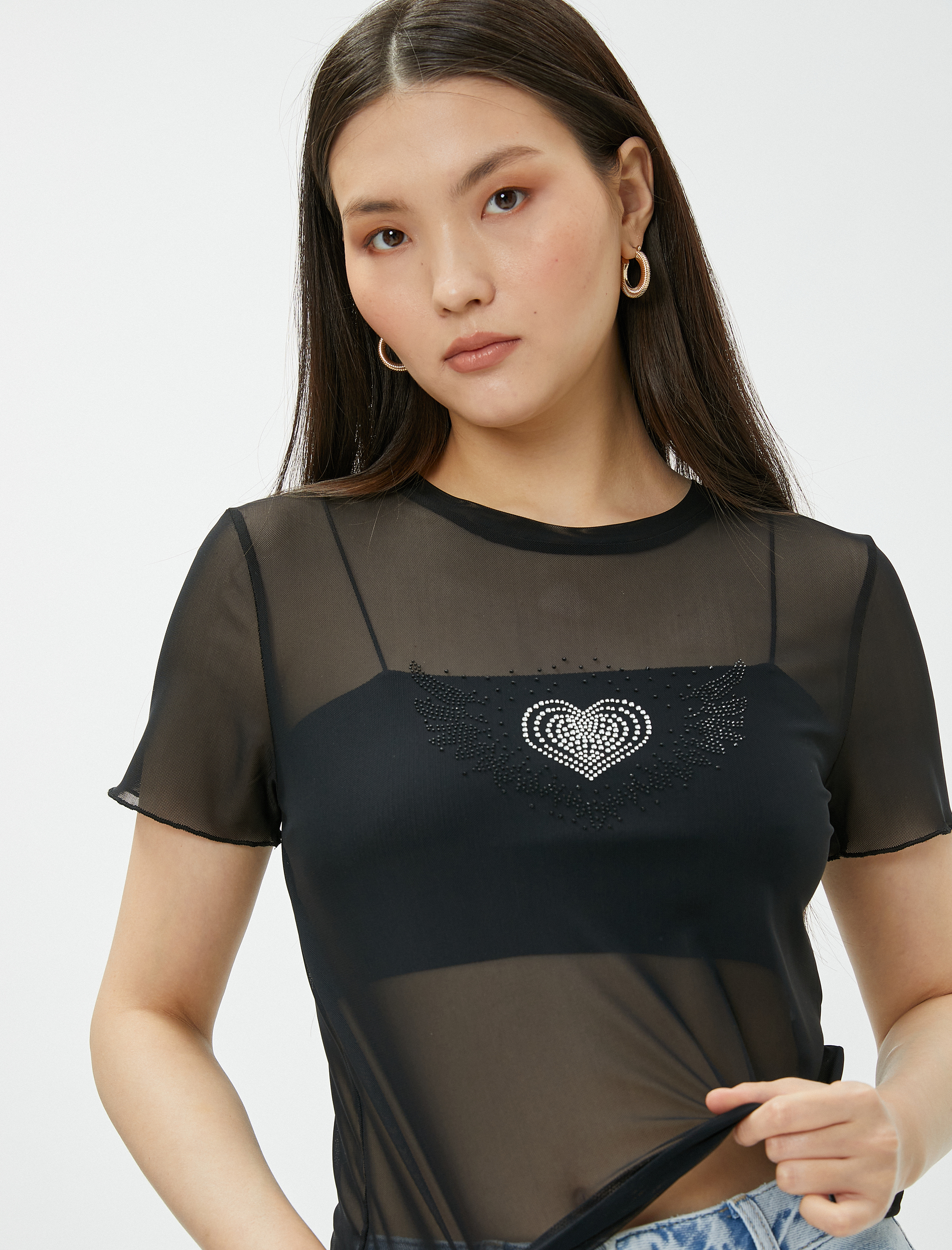 Konfor ve şıklığı bir araya getiren kısa kollu, bisiklet yaka, taşlı, transparan tişörtü üzerinizden çıkarmak istemeyeceksiniz!