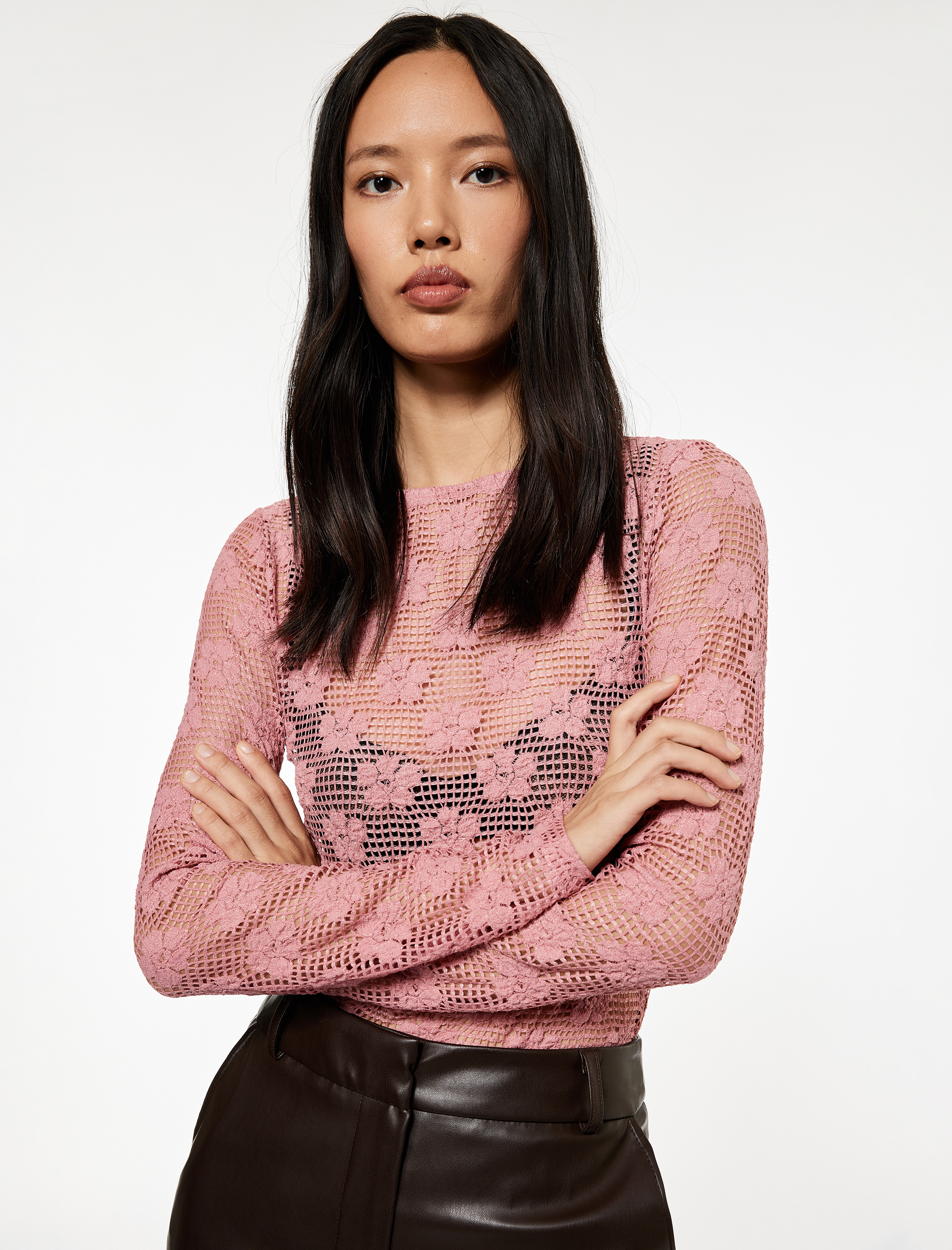 Transparan Uzun Kollu Bisiklet Yaka Çiçekli Dantelli Bluz