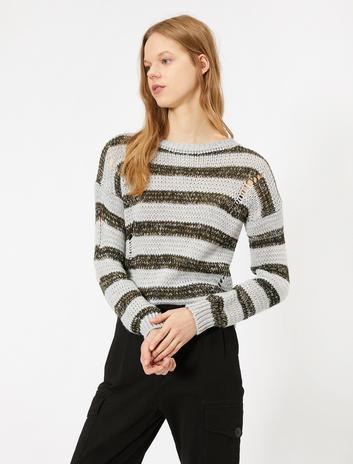 Kız Çocuk Crop Kazak Ajurlu Yuvarlak Yaka Uzun Kollu