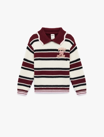 Pamuklu Uzun Kollu Nakış Detaylı Çizgili Polo Yaka Triko Kazak Sepete Ekle