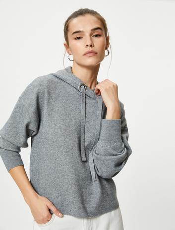 Kapüşonlu Triko Kazak Uzun Kollu Düşük Omuzlu
