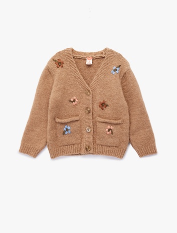 Uzun Kollu Nakış Detaylı V Yaka Düğmeli Triko Hırka Sepete Ekle