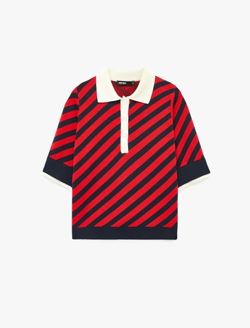 Kısa Kollu Düğmeli Polo Yaka Çizgili Triko Kazak Sepete Ekle