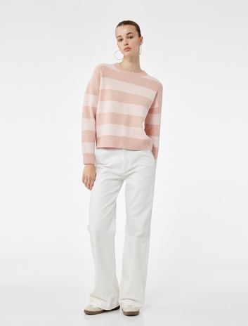 Regular Fit Uzun Kollu Çizgili Dokulu Bisiklet Yaka Triko Kazak