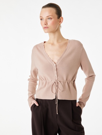 Uzun Kollu Beli Bağcıklı Düğmeli V Yaka Triko Hırka