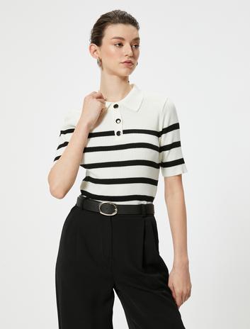 Polo Yaka Kazak Düğmeli Kısa Kollu Şerit Detaylı