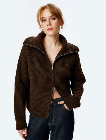 Dik Yaka Fermuarlı Uzun Kollu Triko Hırka