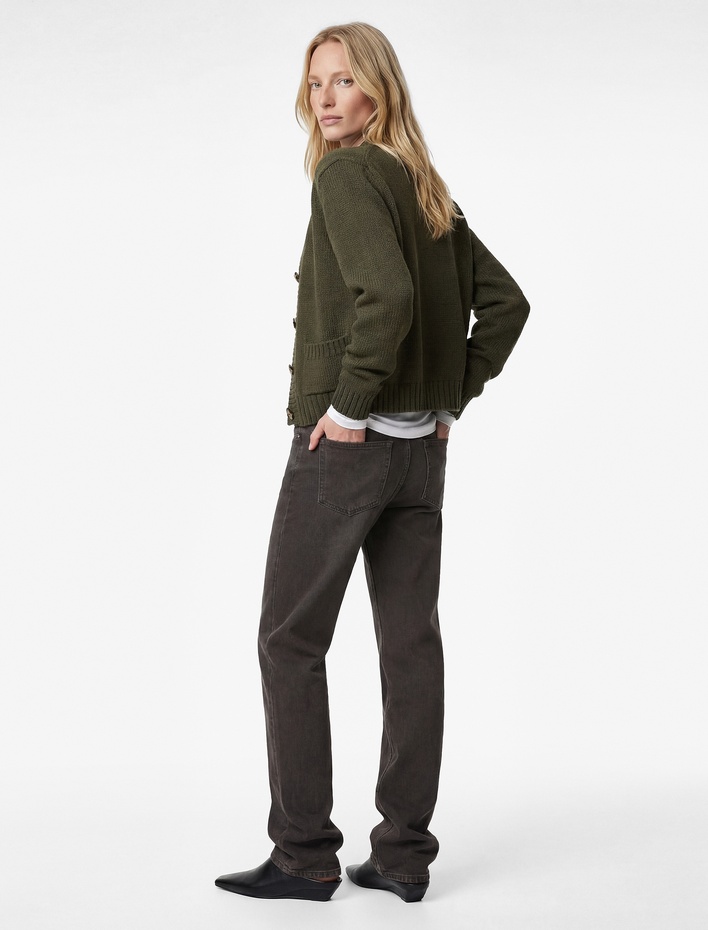Uzun Kollu Cepli Hafif Dik Yaka Düğmeli Triko Hırka