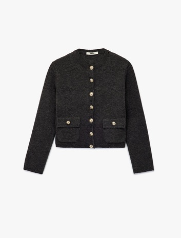 Yuvarlak Yaka Düğmeli Cepli Uzun Kollu Tüvit Hırka