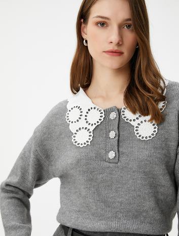 Vintage Görünümlü Kazak Dantel Yaka Düğmeli