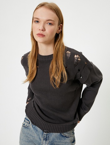 Yırtık Triko Kazak Bisiklet Yaka Akrilik Karışımlı Sepete Ekle