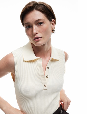 Renk Bloklu Düğme Detaylı Kolsuz Polo Yaka Triko Üst
