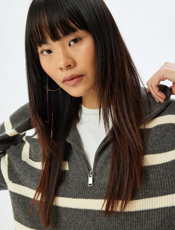 Yarım Fermuarlı Kazak Oversize Dik Yaka Uzun Kollu Renk Bloklu